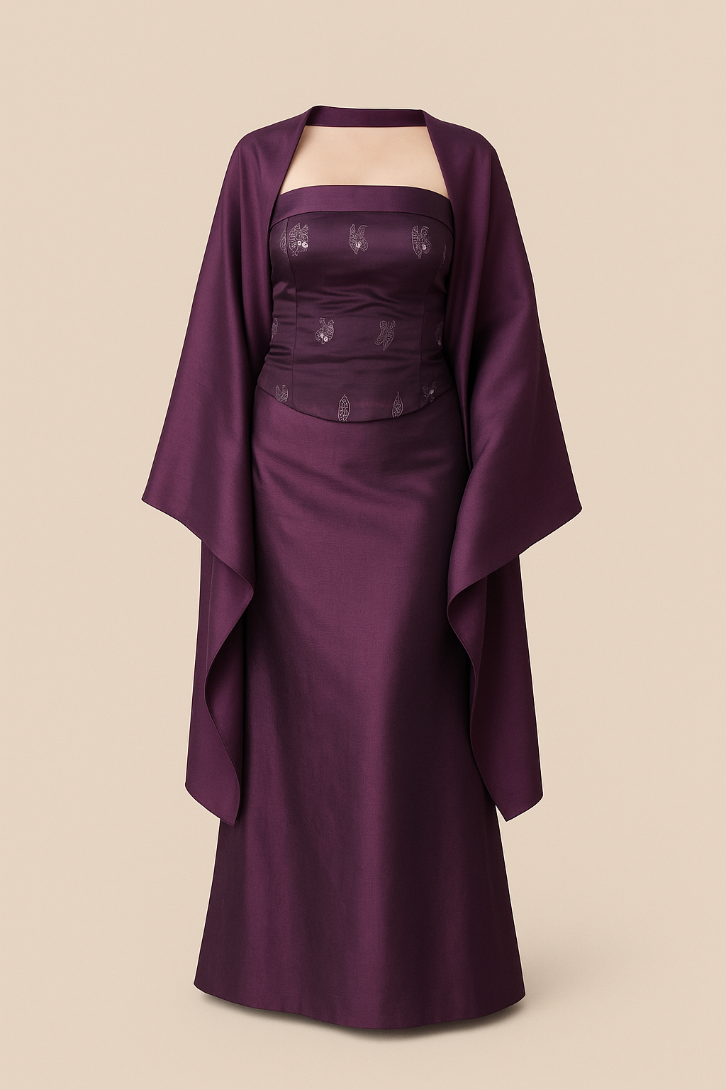 Amastita Real · Conjunto vintage de tres piezas: corsé, falda y chal. Tejido satinado en tono ciruela. Prenda de época en excelente estado.