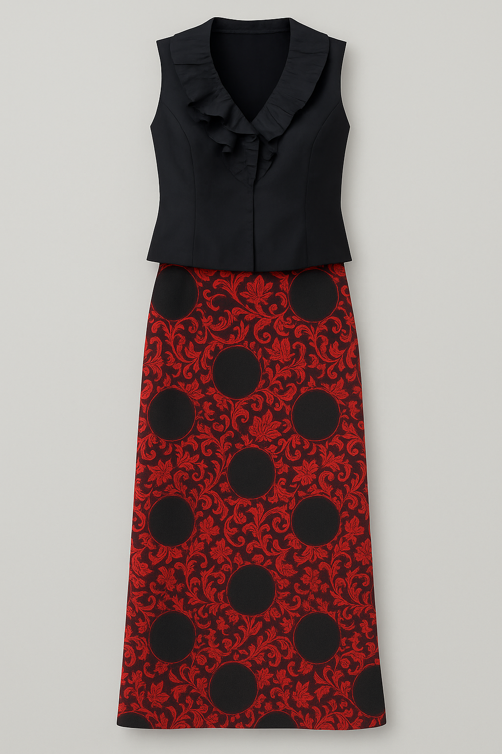 Conjunto Carmen consta de dos piezas: falda y top ajustable por laterales tipo corsé. Top confeccionado en seda salvaje a juego con falda larga estampada