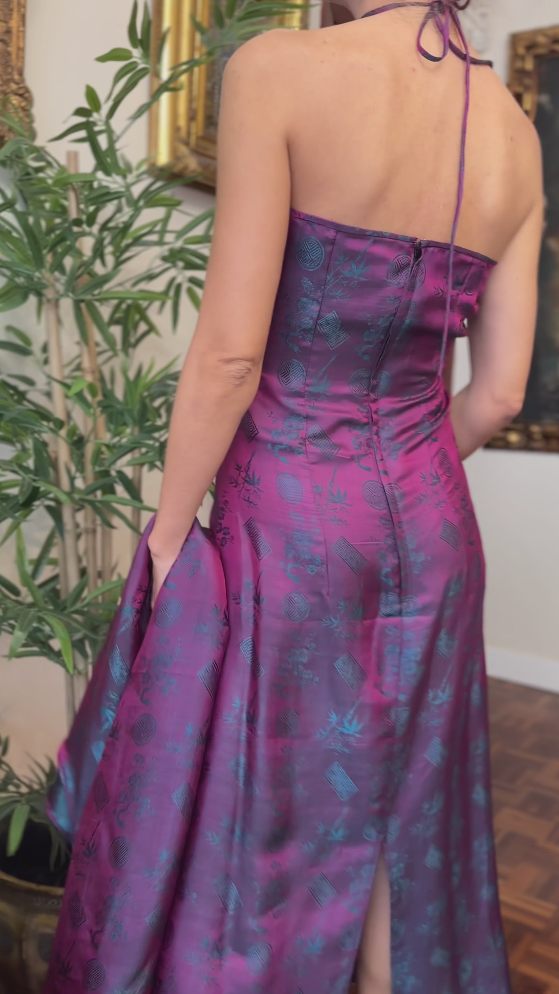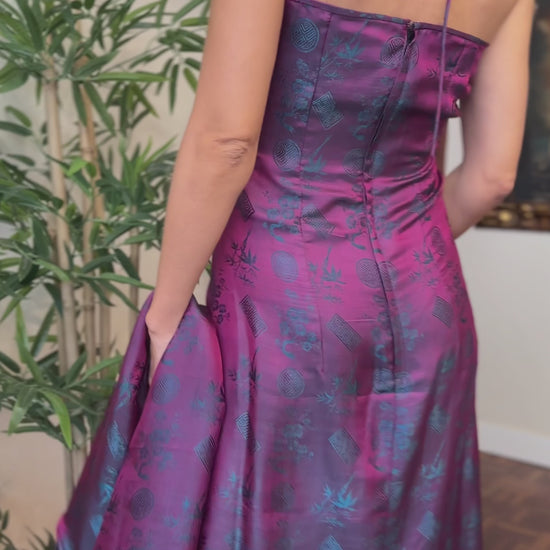 Conjunto de vestidos confeccionados en seda natural y de caída fluida. Estampado de motivos orientales en azul petróleo sobre fondo fucsia. Cuello tipo Mao, corte recto y limpio con aperturas laterales que aportan ligereza al caminar.