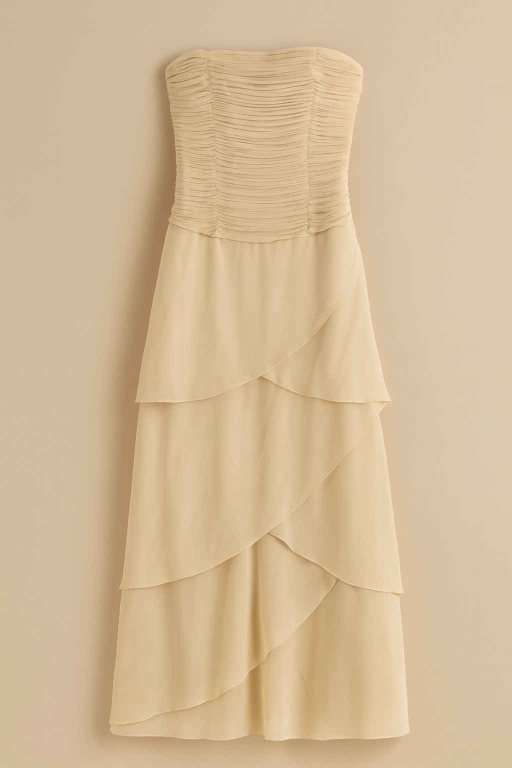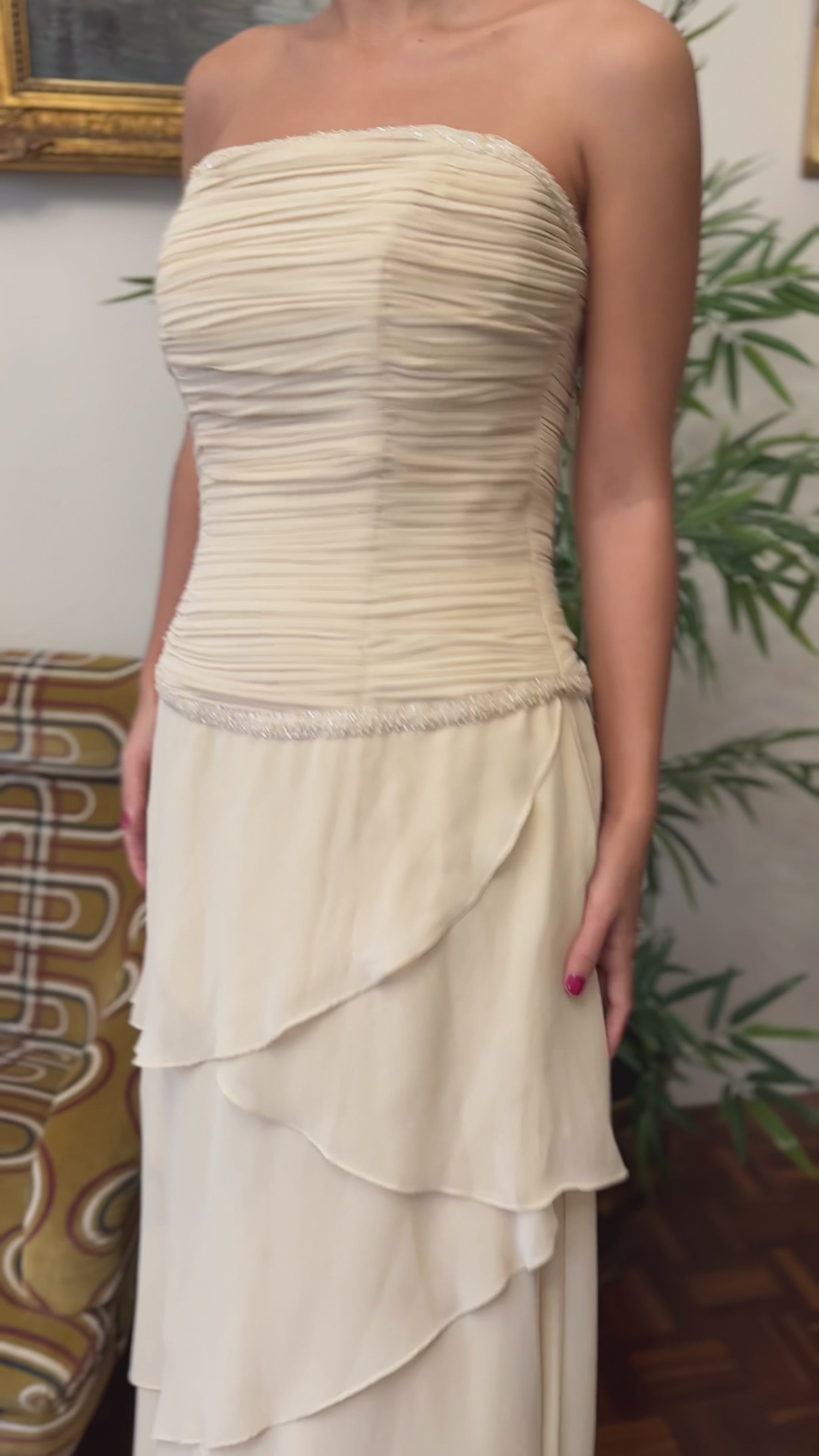 Cuenta con cuerpo fruncido que se ajusta al torso y falda de capas superpuestas en forma de pétalos, aportando movimiento y elegancia. Se encuentra en perfecto estado de conservación. Una prenda exclusiva, femenina y atemporal.